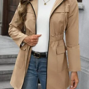 The Casual Cinched Waist Hooded Mid Length Windbreaker is the perfect blend of style and functionality, designed to elevate your everyday wardrobe. Featuring a modern silhouette with a cinched waist, this jacket offers a flattering fit that complements various body types effortlessly. Its mid-length cut provides excellent coverage and adds a touch of chic sophistication to casual outings or on-the-go activities.