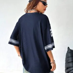 Crafted with a V-neckline and drop shoulders, this oversized T-shirt provides a flattering fit suitable for all body types. The football jersey-inspired design adds a sporty edge to your wardrobe, making it a perfect choice for creating trendy athleisure looks. The loose fit keeps you comfortable throughout the day, while the breathable fabric ensures a lightweight feel and promotes ease of movement.
