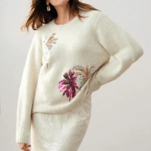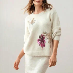 What truly sets this sweater apart is its unique coconut tree embroidered design. The artwork showcases delicate sequins stitched together to embody a breezy and tropical aesthetic, making the sweater a standout piece in your wardrobe. The thoughtful detailing adds personality to your outfit, making it the perfect attention-grabber for seasonal gatherings, daytime strolls, or even a laid-back coffee date. Not only does the motif evoke a sense of tropical charm, but it also marries beautifully with the warm hues of fall fashion.