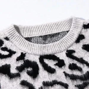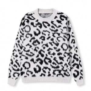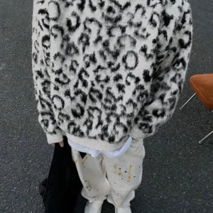 The standout feature of this sweater is its unique leopard patchwork, which elevates your outfit to new heights of style. The pattern seamlessly blends with mohair’s natural texture, offering a sophisticated yet edgy vibe. Pair it with slim-fit trousers or dark denim to create a balanced look that feels tailored yet relaxed.